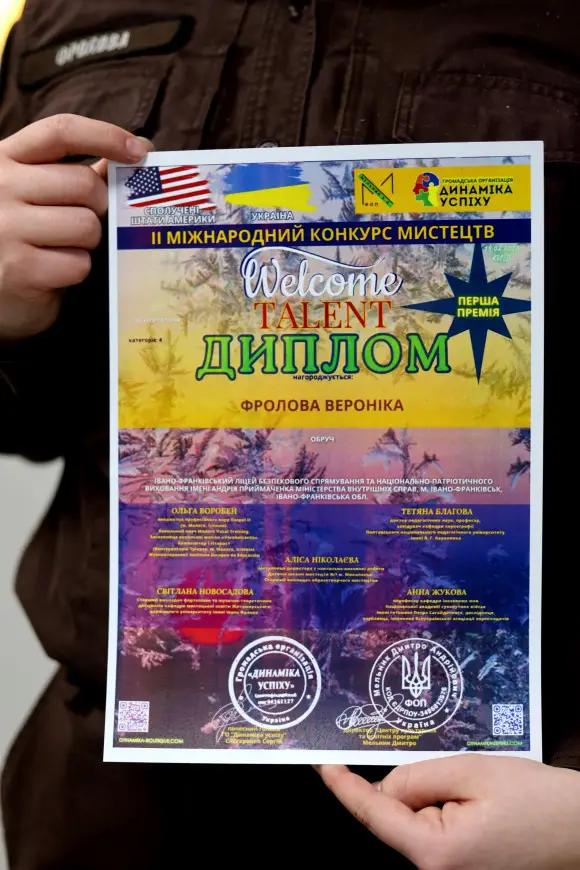 З 5 по 19 лютого відбувся ІІ Міжнародний конкурс мистецтв «WELCOME TALENT», що об’єднав учасників зі Сполучених Штатів Америки та України у спільному творчому просторі. Серед сотень учасників свою майстерність гідно представила вихованка Івано-Франківського ліцею МВС імені Андрія Приймаченка – Вероніка Фролова👏.