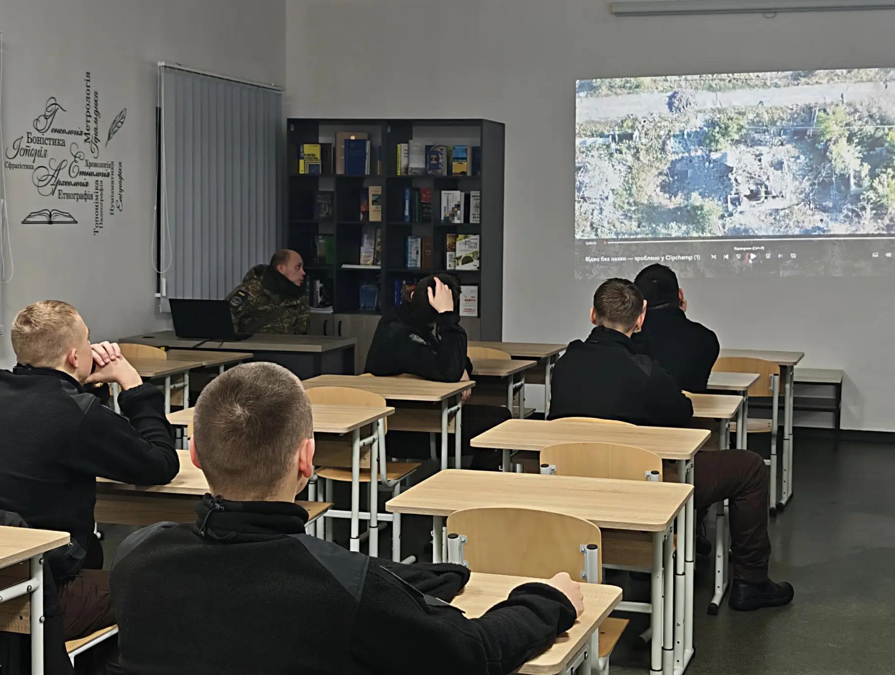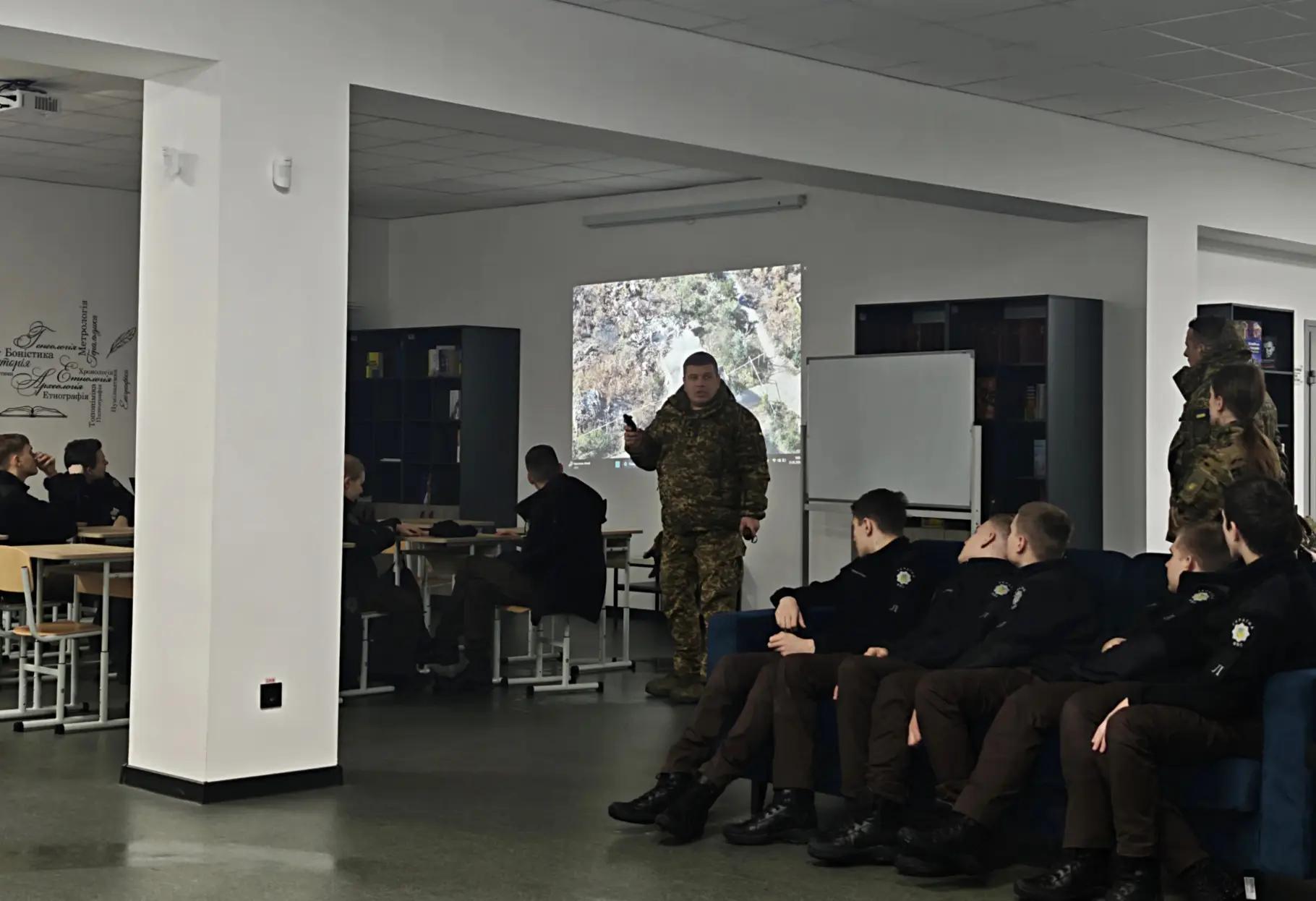 📚 Після практики заняття продовжилося в бібліотеці ліцею, де військові детальніше зупинилися на теоретичних аспектах використання сучасних технологій. Ліцеїстам також продемонстрували відеоматеріали, що наочно показують застосування НРК і дронів у реальних умовах службової діяльності підрозділів Національної гвардії України.